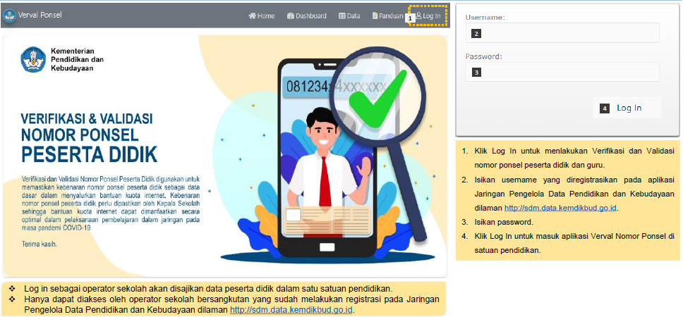 Log In untuk masuk aplikasi Verval Nomor Ponsel di satuan pendidikan